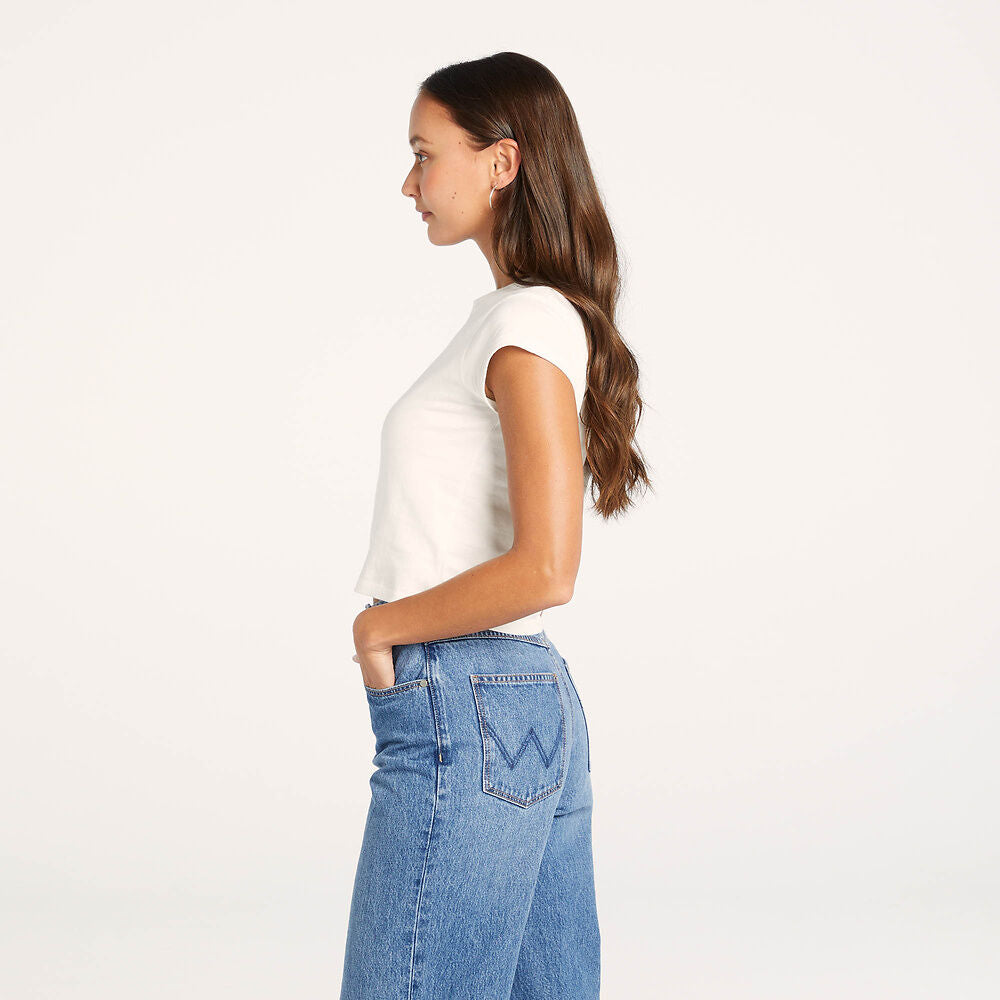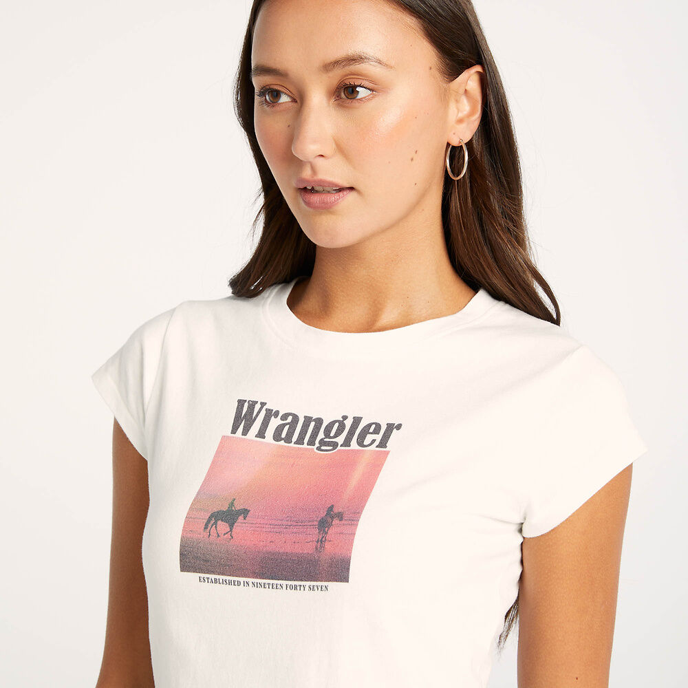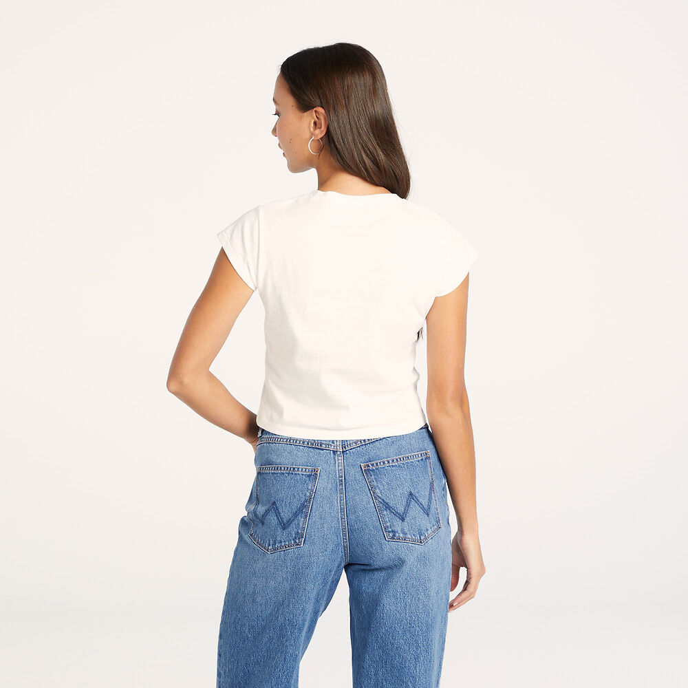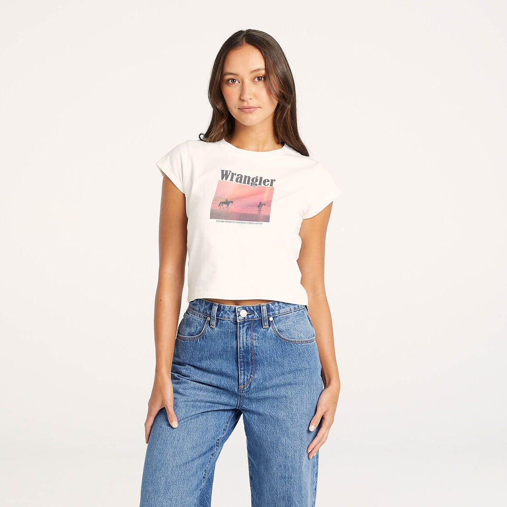 Our Baby Tee is a nod to classic 90s shapes. Fitting slim through the body, this tee is cropped to to sit at a flattering length. Perfect to pair back with all your favourite Wrangler denim pieces.