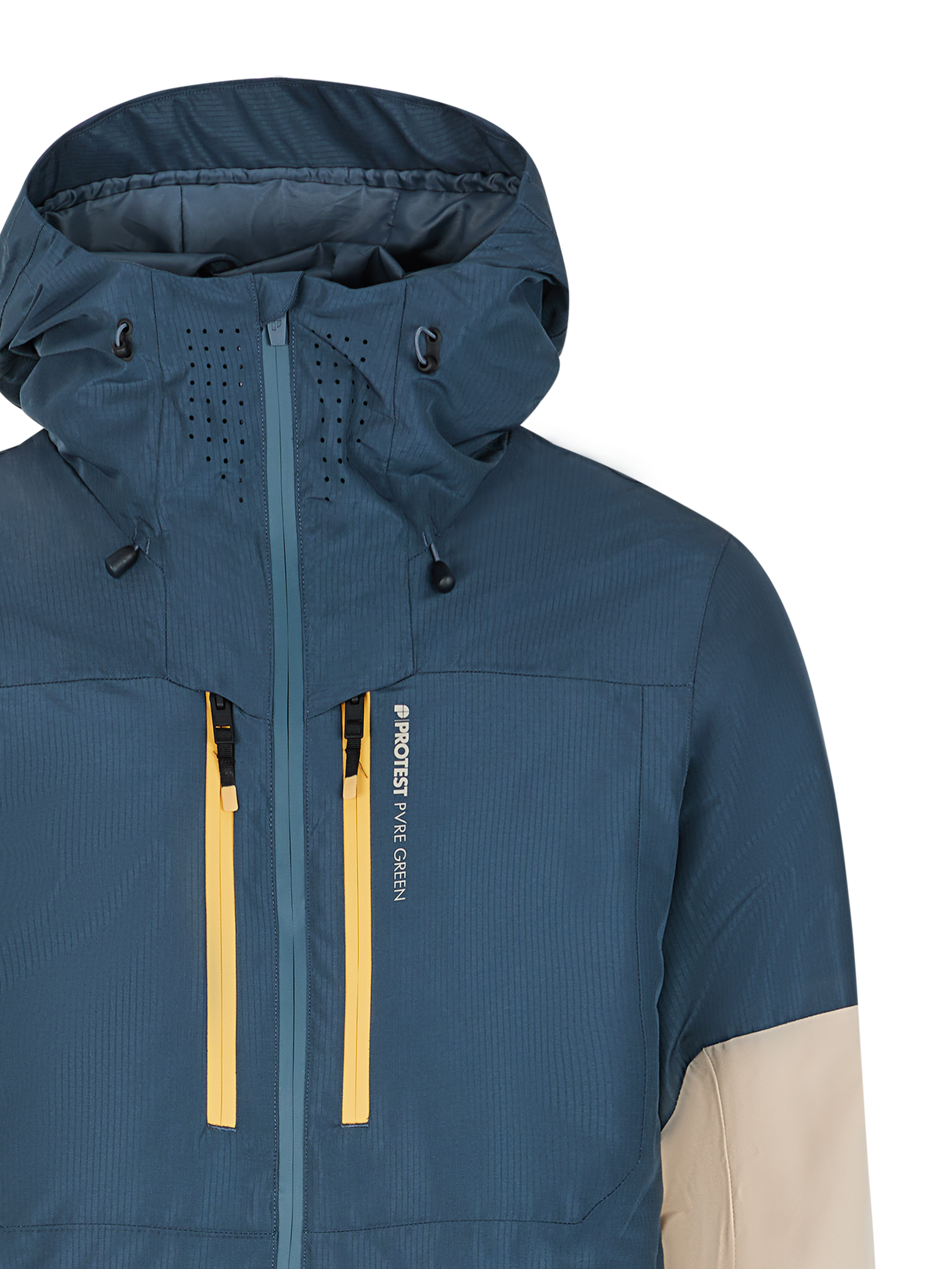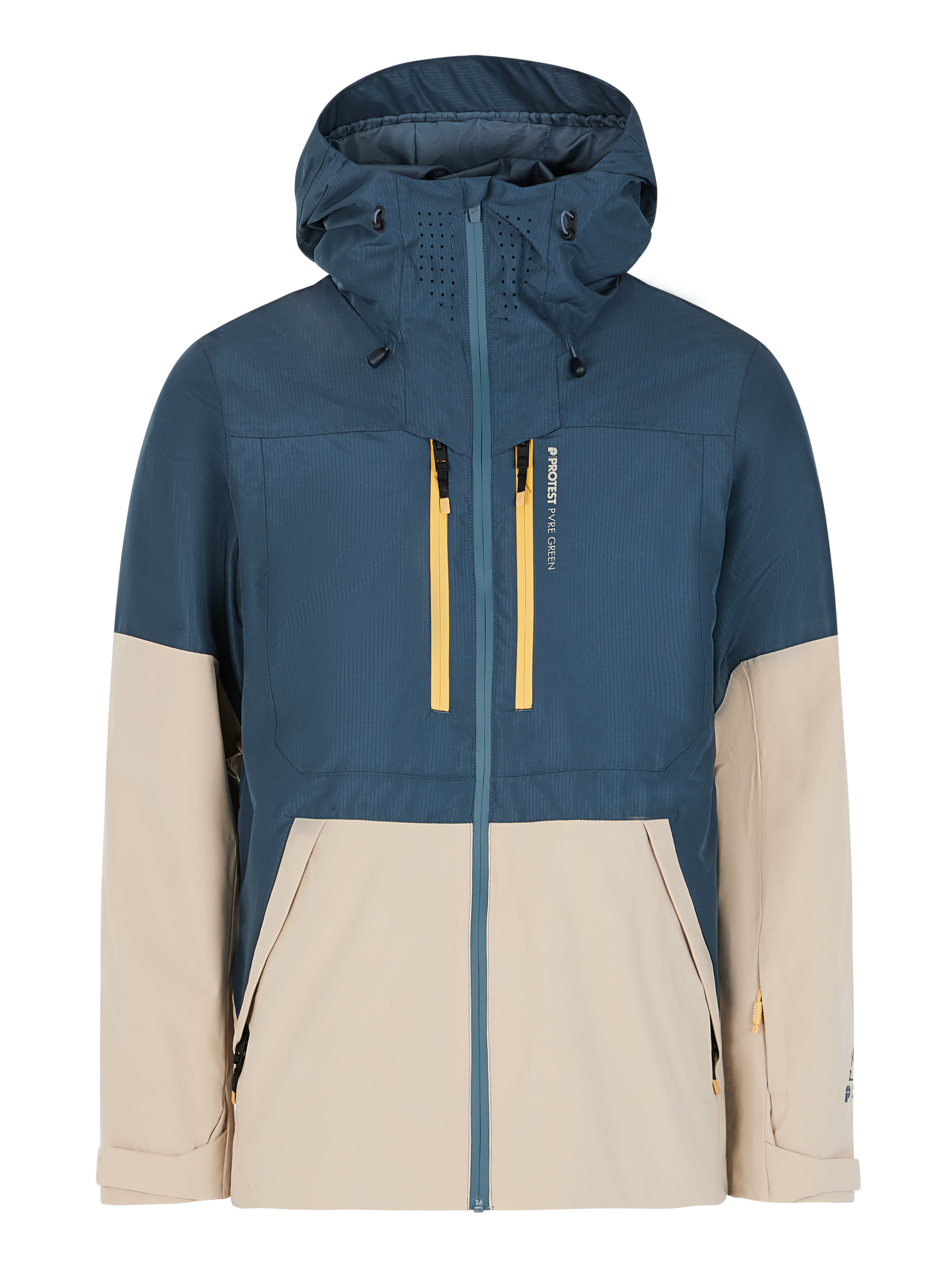 The PRTBAKIE ski and snowboard jacket by Protest combines style and practicality with an eco-friendly design. Part of our PVRE Green series, the PRTBAKIE is made of recycled materials and is free of harmful PFCs. The PRTBAKIE has plenty of useful design features, such as the helmet-compatible fixed hood with high collar, goggle pocket, waist gaiter and lift pass pocket. The 20g breathability and 20K water-repellent finish let excess moisture out while shielding you from moisture from the environment. Full taping, ventilation zips under the armpit and water-repellent front zips? Check! The Lycra inner cuffs with thumb hole are practical while on the slopes. The contrasting zips and Protest logo complete the look. The PRTBAKIE is available in a slim fit and length.