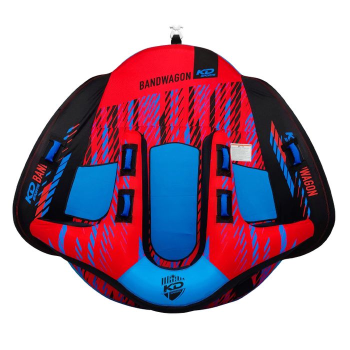 All aboard the KD Bandwagon, this updated cockpit design pairs the comfort of a sofa style with the performance of a winged style tube! Doubling the value this summer, KD Sports have added an extra tow point to rear of the Bandwagon, so once you’ve finished lounging in the couch position just spin it around and kneel for a white knuckled chariot ride. Thanks to its unique sweep wing design, the Bandwagon it provides an incredibly low amount of drag for a tube of it size, not only does this provide exhilarating ride that rocks and rolls but it’s incredibly efficient, opening the door to smaller powered vehicles or just those who are conscious of how quickly the fuel gauge drops when towing a massive tube all day. The aptly named KD Bandwagon allows riders to sit up high and clear from the water, it’s cart like design recesses riders within an inflatable cushioned backrest that extends the entire back half of the tube, the middle rider is sat slightly forward too, helping to avoid accidental collisions with other passengers. Aimed at something the whole family can enjoy the all-new Bandwagon offers a sense of security unmatched by other models, allowing them to relax as the flat base skips outside the wake into the flats, yet the inflated cockpit floor which cushions riders from the heaviest jolts still provides moments of weightlessness as you cross the wakes. As the largest tube in the range, KD Sports have gone overboard and spec’d it up with an ultra-heavy duty 820D nylon cover and 30gauge virgin PVC bladder to help ensure longevity, the Bandwagon also features 10x deluxe nylon-wrapped grab handles with neoprene knuckle guards to provide plenty of grip and a multitude of different riding positions. Do hesitate this summer to jump aboard because if you wait the KD Bandwagon will be full and with the amount of fun this monster tube offers who knows when you’ll get a turn!