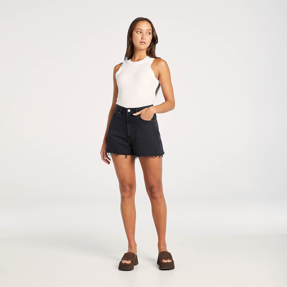 The Hi Bells Short has a high rise and is fitted through the top block with an A-line silhouette that creates fuller coverage. This can be worn with the cuff rolled for a more cheeky length. Made in a washed black colour with a raw hem detail.